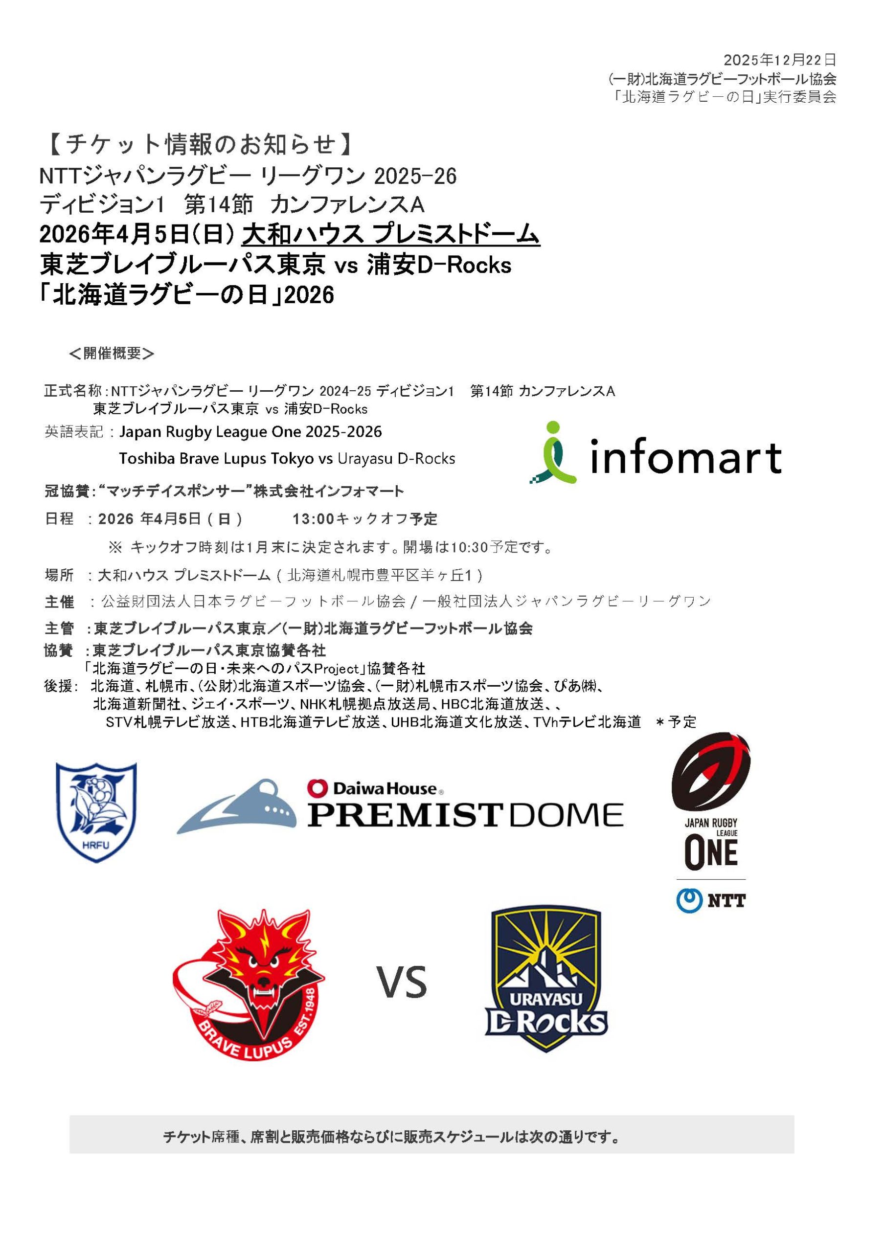 2026年4月5日(日)大和ハウス プレミストドームでのBL東京vs浦安D-Rocks、「北海道ラグビーの日」2026、チケット発売日程が次の通り確定しましたことお知らせ申し上げます。PDFはこちらからBL東京vs浦安DRチケット情報のお知らせ_1222
