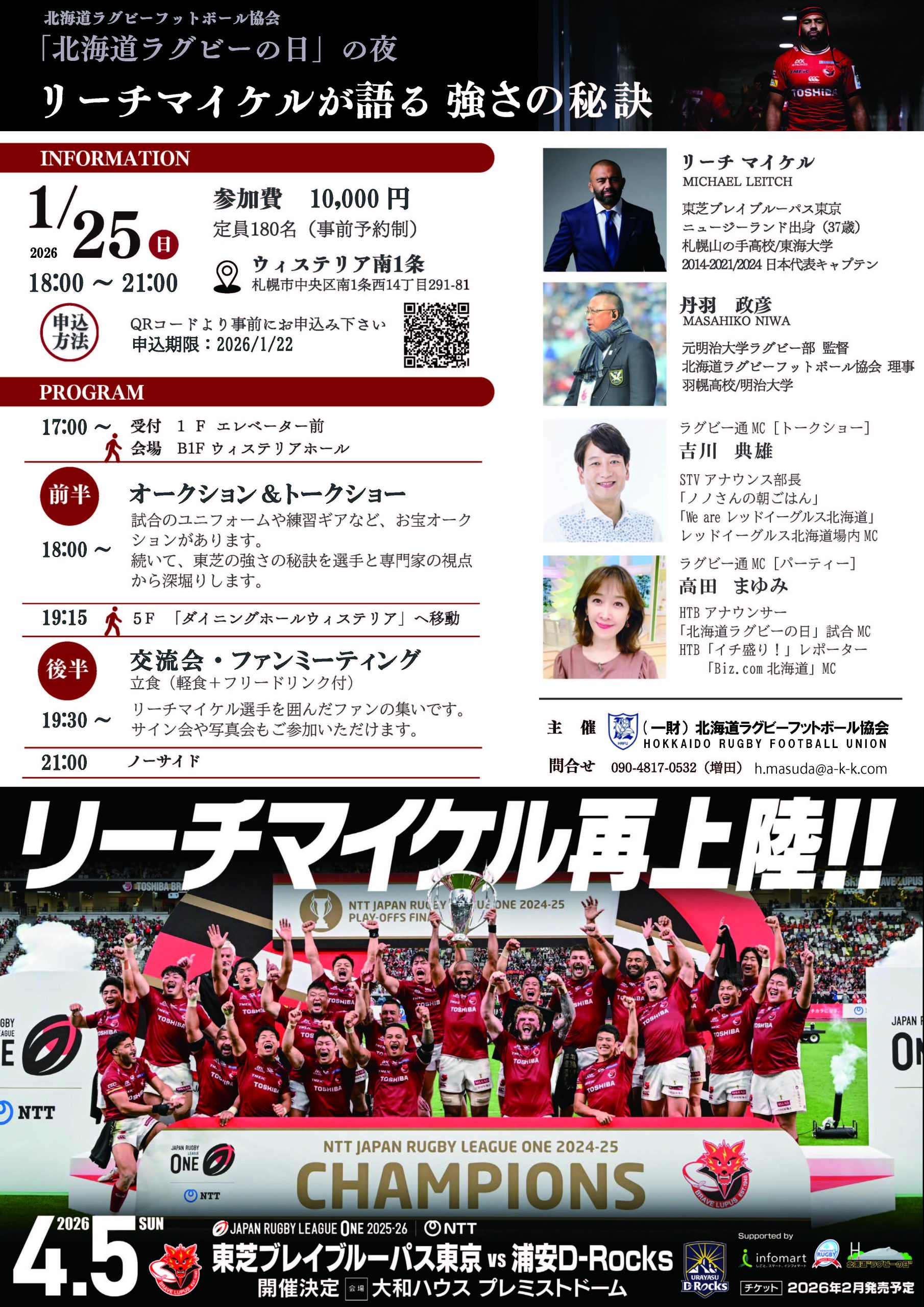 4月5日(日)大和ハウス プレミストドーム(札幌ドーム)で行うジャパンラグビーリーグワン公式戦 東芝ブレイブルーパス東京✕浦安D-Rocks戦を前に、札幌山の手高校出身のリーチ マイケル選手が1月25日(日)札幌市内でトークショーやファンとの熱い交流会を行います。