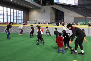ドームのアリーナをフル活用し、様々なスポーツ体験を親子でできる貴重なイベントです。会場には初日、3千人を超える親子が来場。アリーナ奥ではラグビー体験会を実施。たくさんの親子にパスやラインアウトを通じてラグビーの魅力を体感してもらいました。また、場内の大型ビジョンでは4月5日にこの会場で行われるジャパンラグビーリーグワン公式戦 東芝ブレイブルーパス東京✕浦安D-Rocksの告知を実施し、多くの人に見て頂きました。