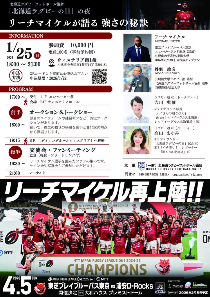 4月5日(日)大和ハウス プレミストドーム(札幌ドーム)で行うジャパンラグビーリーグワン公式戦 東芝ブレイブルーパス東京✕浦安D-Rocks戦を前に、札幌山の手高校出身のリーチ マイケル選手が1月25日(日)札幌市内でトークショーやファンとの熱い交流会を行います。当日は軽食とフリードリンク付きですが食事のメニューが決まりましたのでご案内いたします。