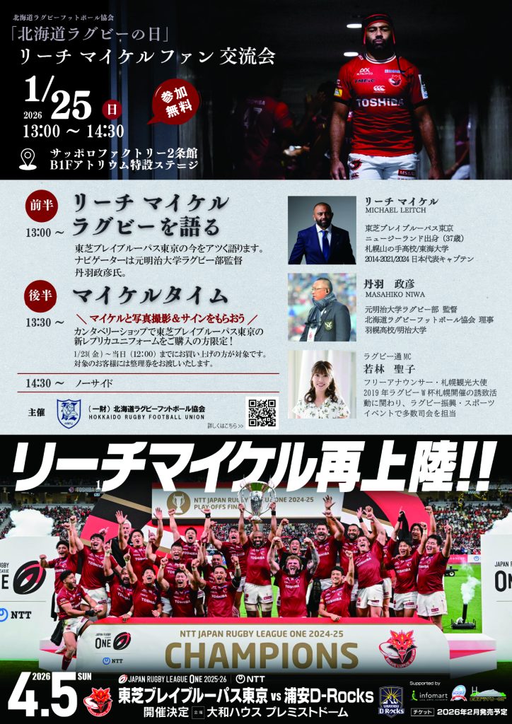 北海道ラグビーフットボール協会は4月5日(日)に大和ハウス プレミストドーム(札幌ドーム)で、ジャパンラグビーリーグワン公式戦 東芝ブレイブルーパス東京vs浦安D-Rocks戦を行います。これに先立ち今月25日にサッポロファクトリーの地下一階アトリウムでリーチ マイケルのトークショーを実施します。入場は無料。